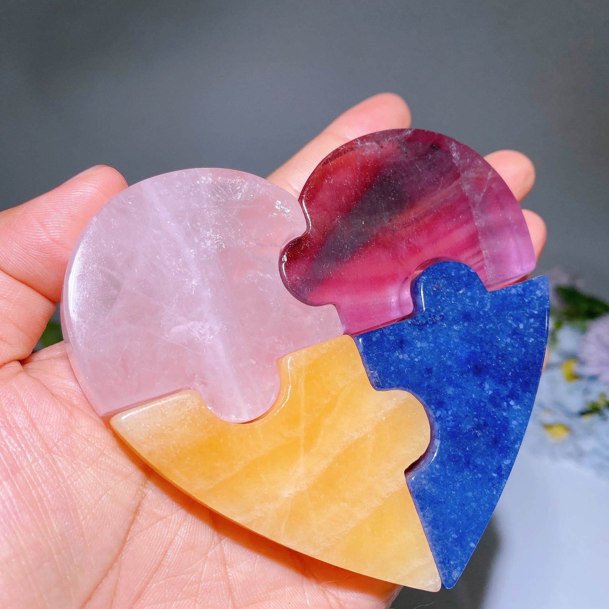 Each heart has 4 pieces, including Rose Quartz, Fluorite, Orange Calcite and Blue Aventurine.