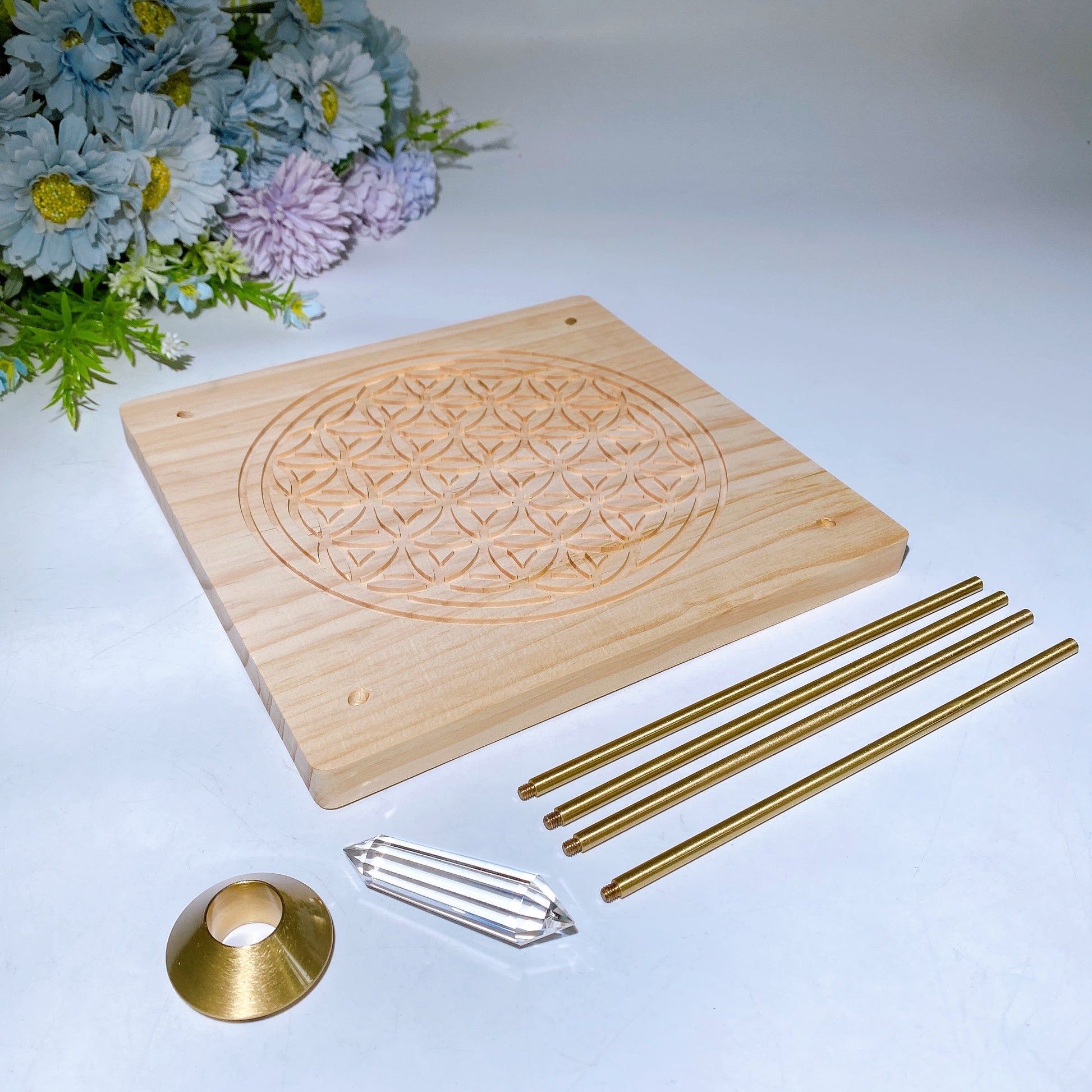 Vogel Copper Pyramid with Faceted Clear Quartz DT Point & Life Flower Wooden Base Crystal Healing Bulk Wholesale