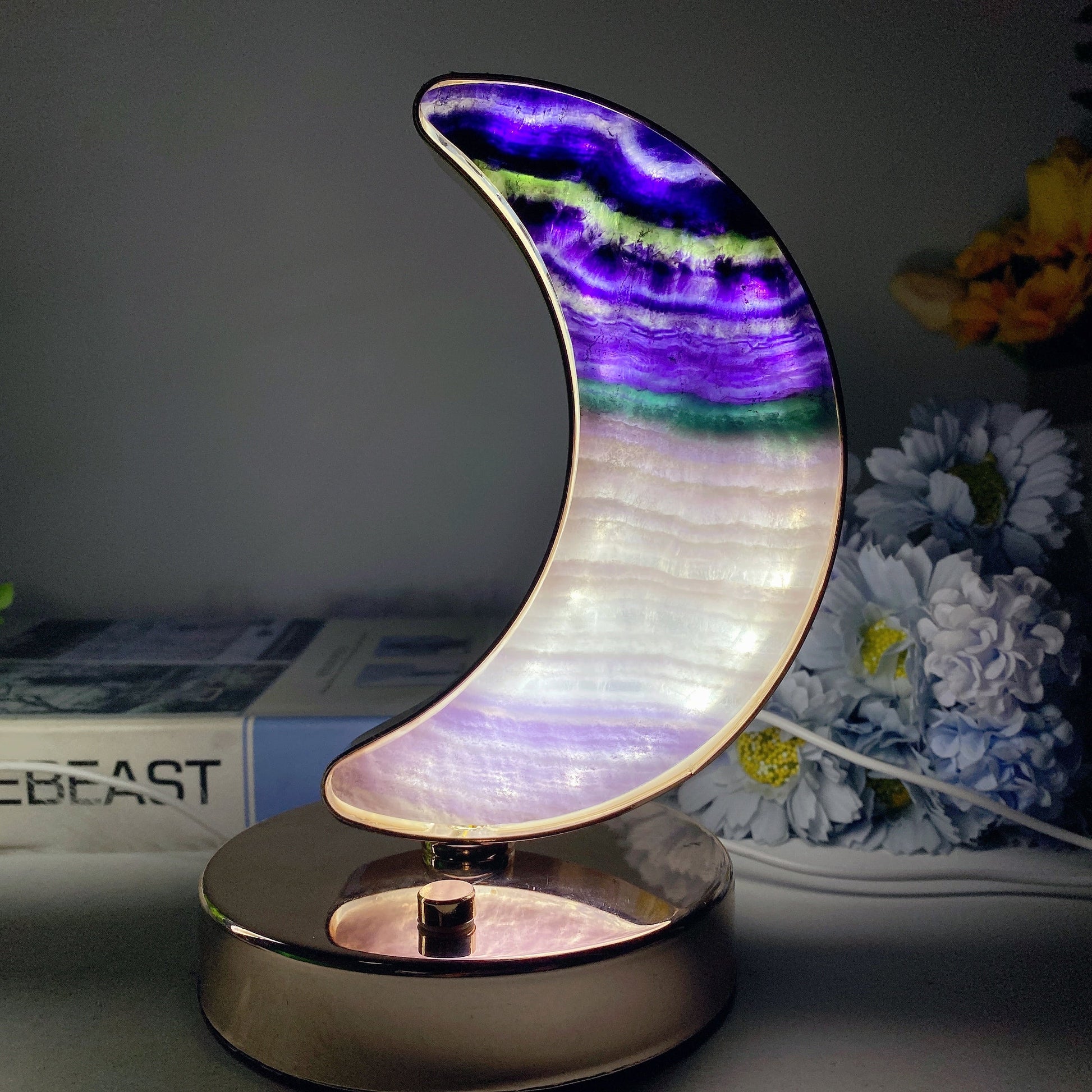 Moss Agate Fluorite Heart Moon Shape Lamp with USB Free Form Bulk Wholesale