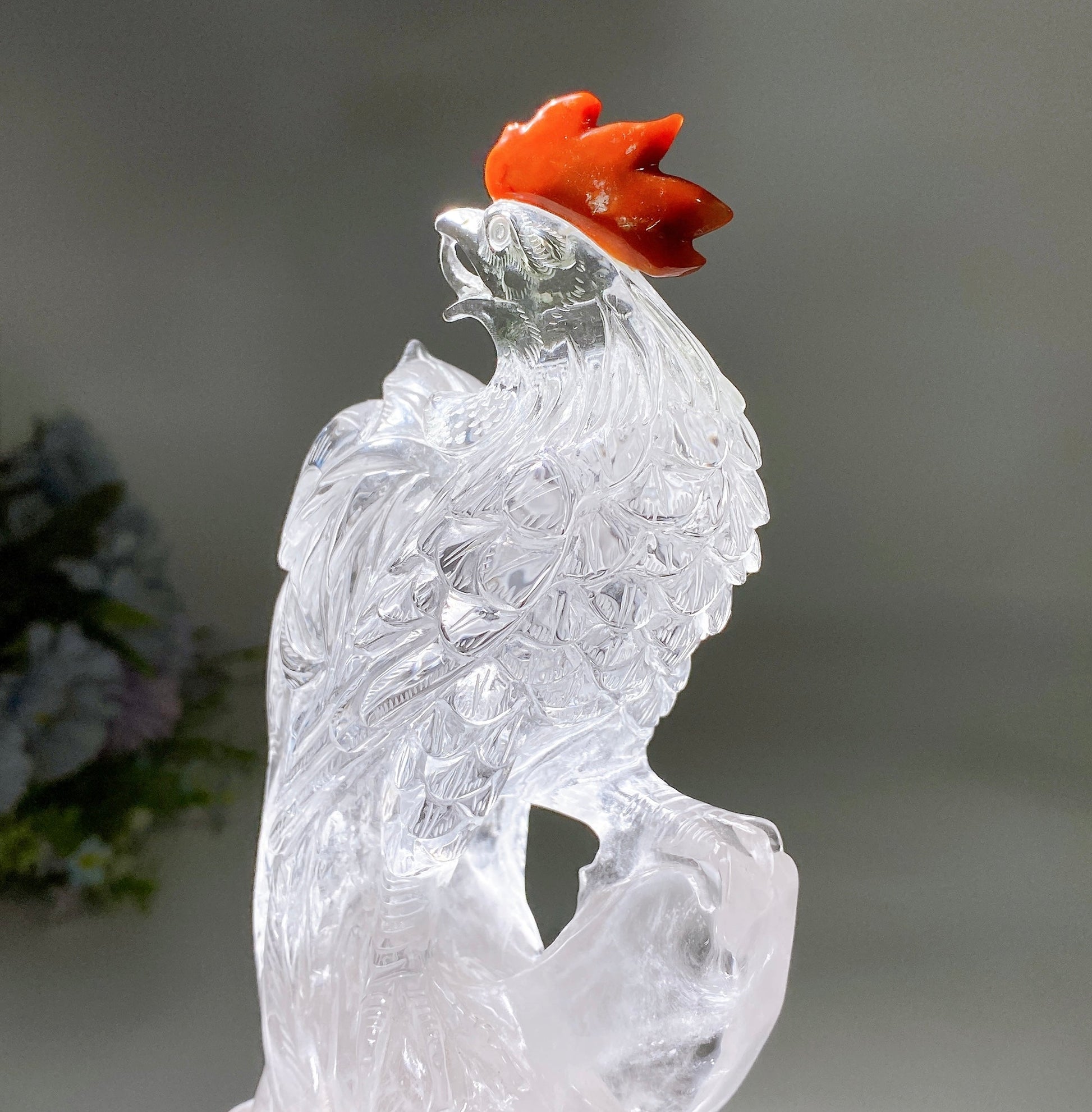 Unique Clear Quartz with Carnelian Rooster Carving with Wooden Stand Crystal Healing Bulk Wholesale
